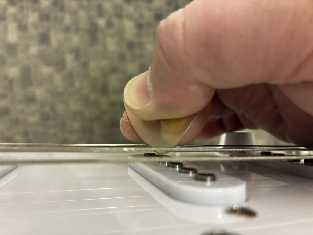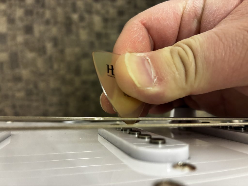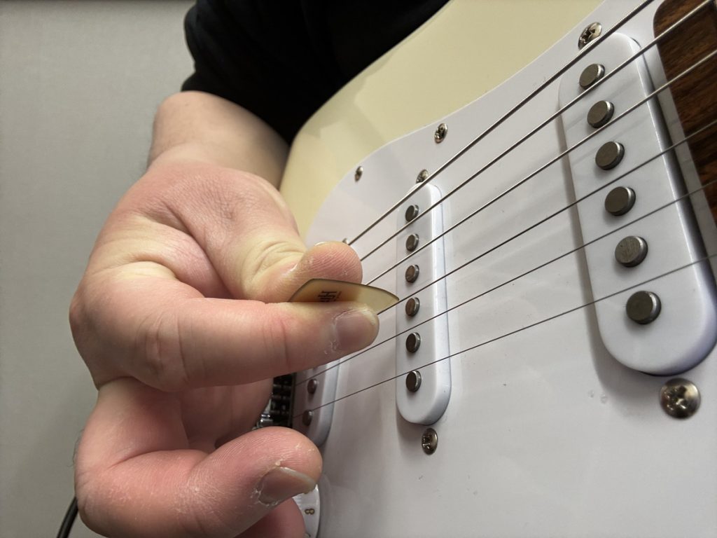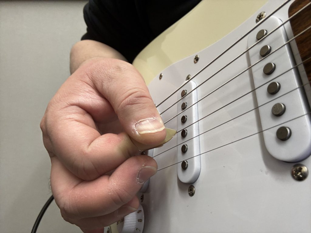その動きのままピックをつまみ、その動きのままピックを弦に当ててみましょう。