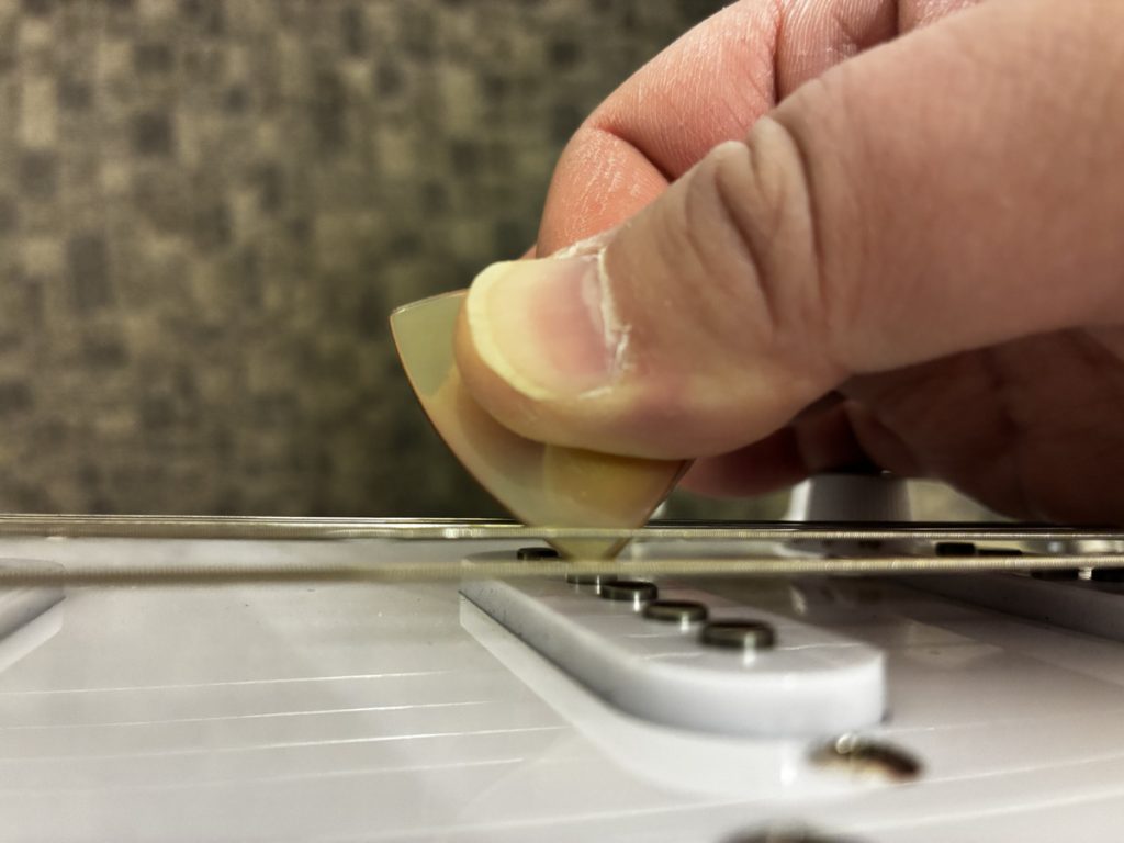 純アングルのピッキングが抵抗が少なくて弾きやすいと思います。
