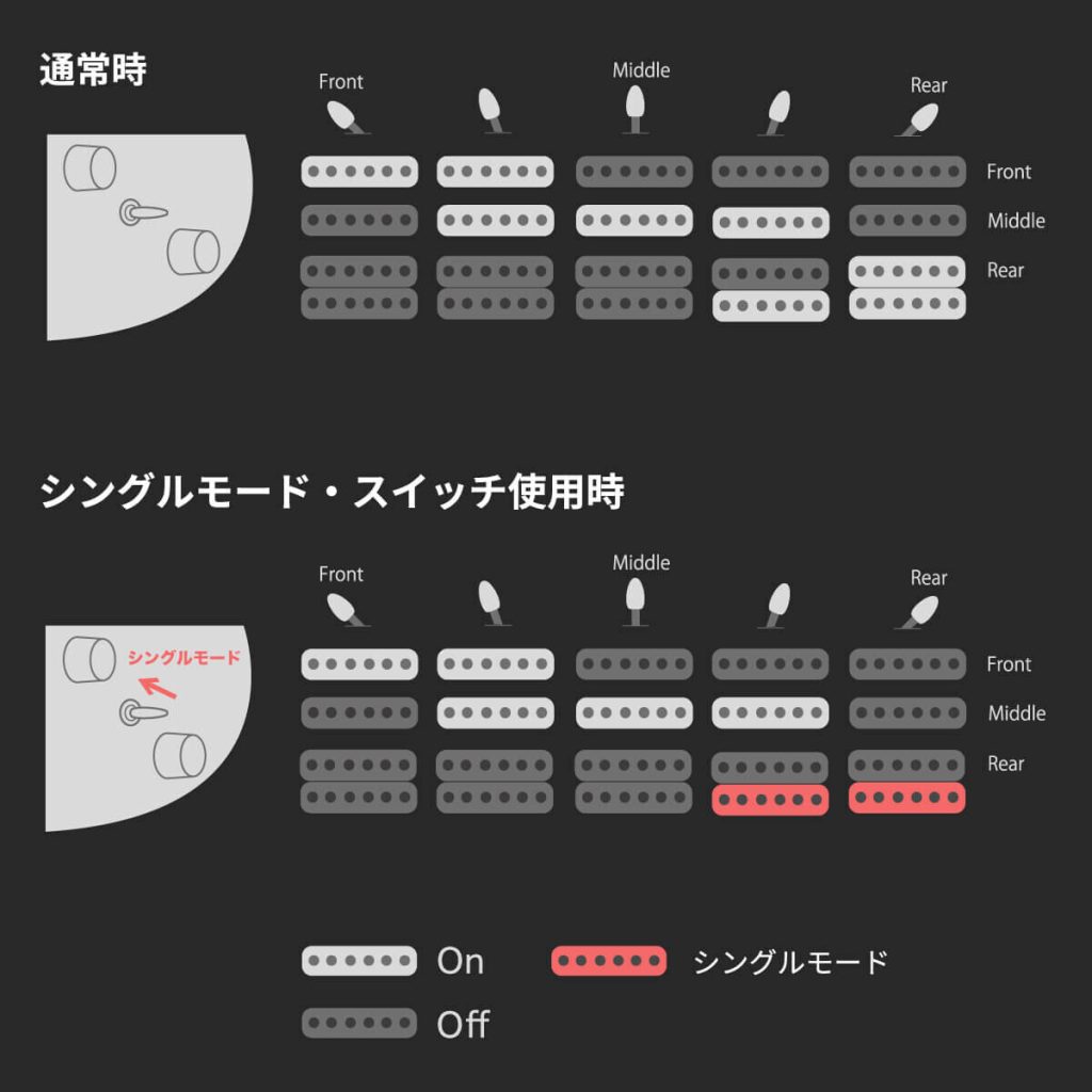 ハムバッカー特有の音圧感を保ちながら、シングルコイルのようなキレのあるサウンドを出力する「シングルモード・スイッチ」を完備。