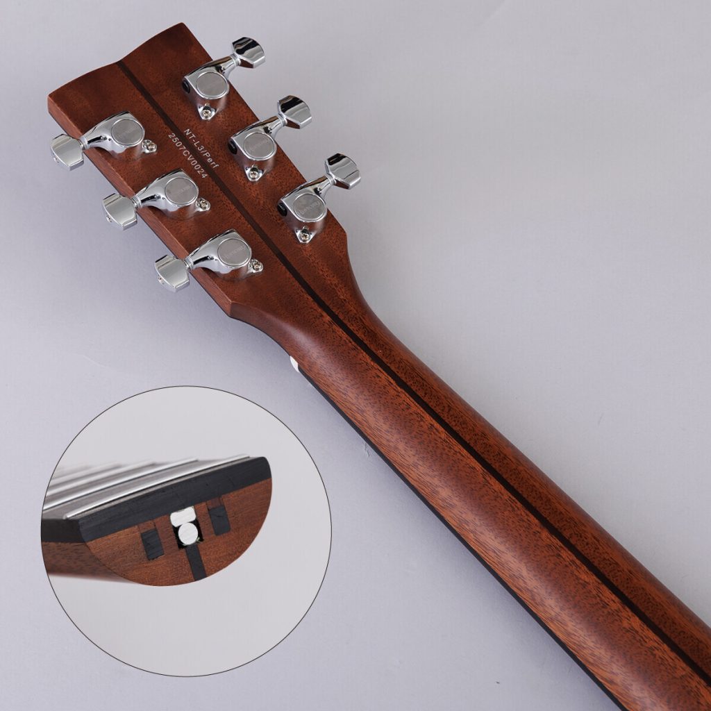 アフリカン・マホガニーネックにはカーボンサポートバーを内蔵し、反りやねじれに強い高い安定性を確保。フレットには酸化やサビに強い高耐食性ニッケルシルバーフレットを採用しています。