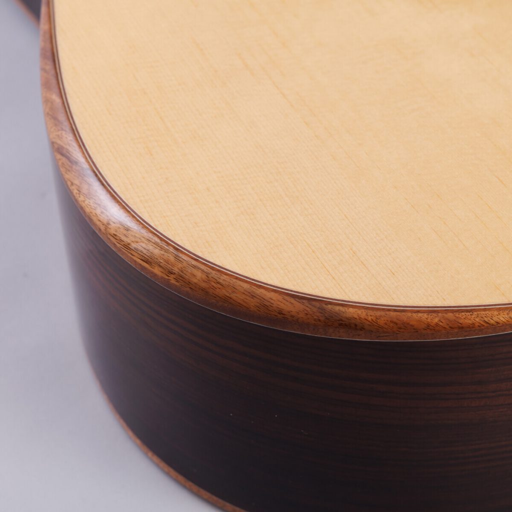 ボディトップにはスプルース、サイド&バックにはローズウッドを採用したオール単板構造により、芯のある輪郭と深みのある響きを実現。エルボーカットのコンター加工により、抱えやすく長時間の演奏でもストレスを軽減します。