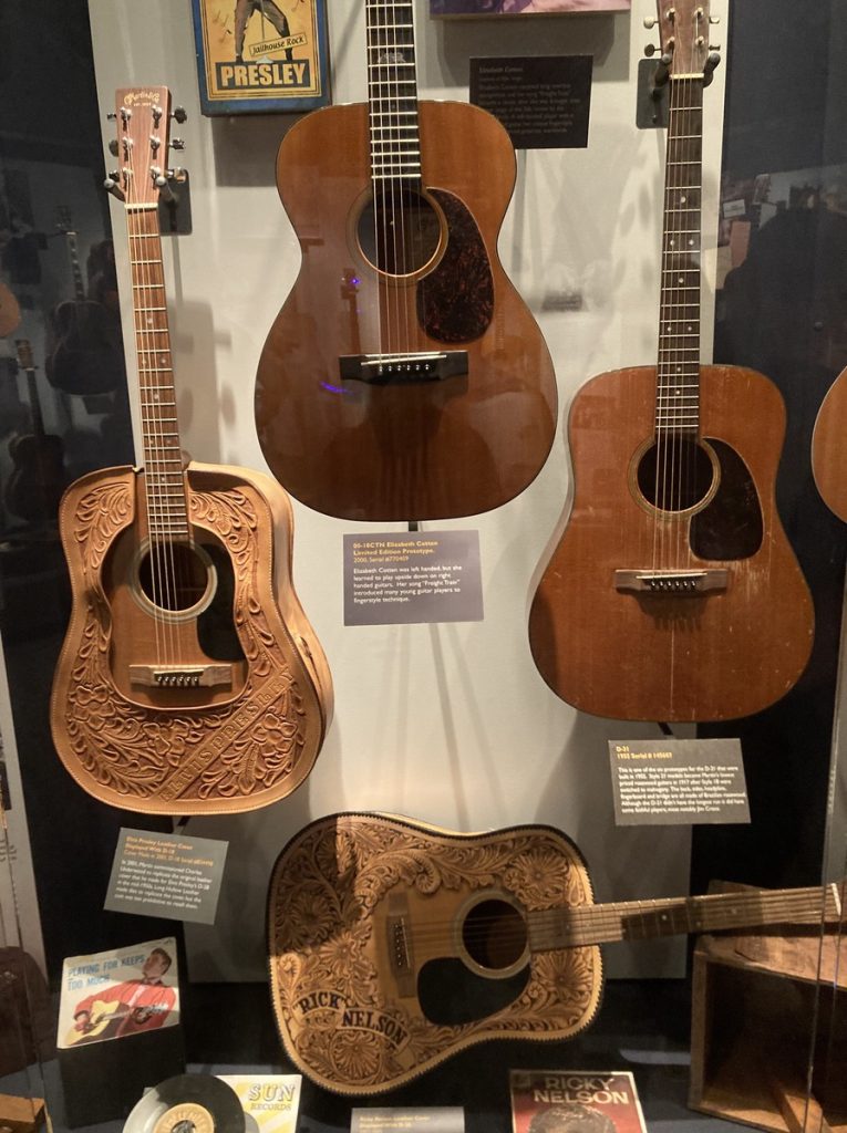 エルヴィス・プレスリーが使用したD-18をはじめ、カート・コバーンやジョン・メイヤー、クラプトンモデルなどアーティスト関連ギターも多数展示。