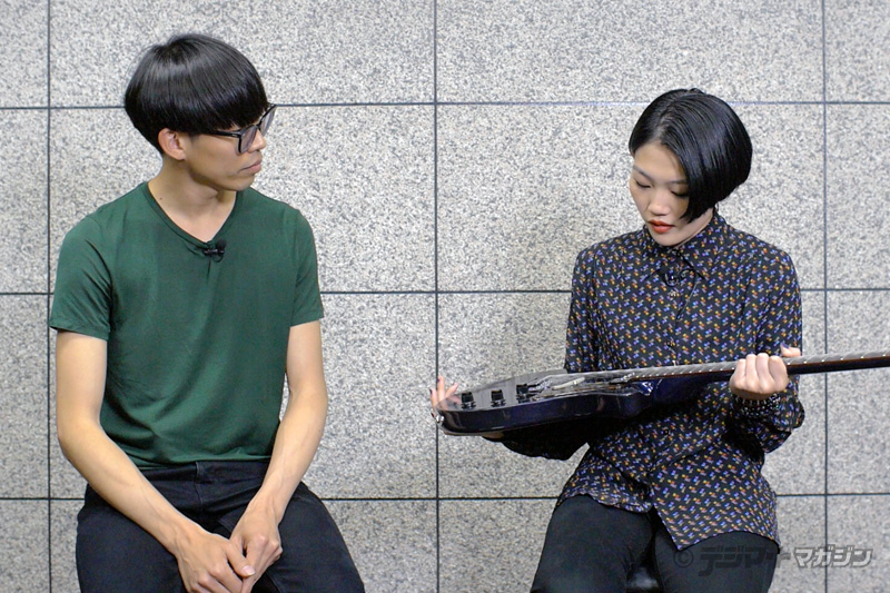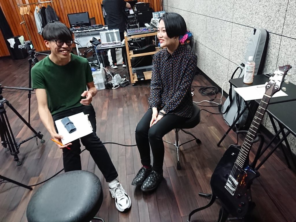 撮影チームとのディスカッションから始めます。栗山さんはこのような楽器レビューの撮影は初めてということで緊張気味。そこは坂本さんがフォローしながら和気あいあいと撮影が開始されました。