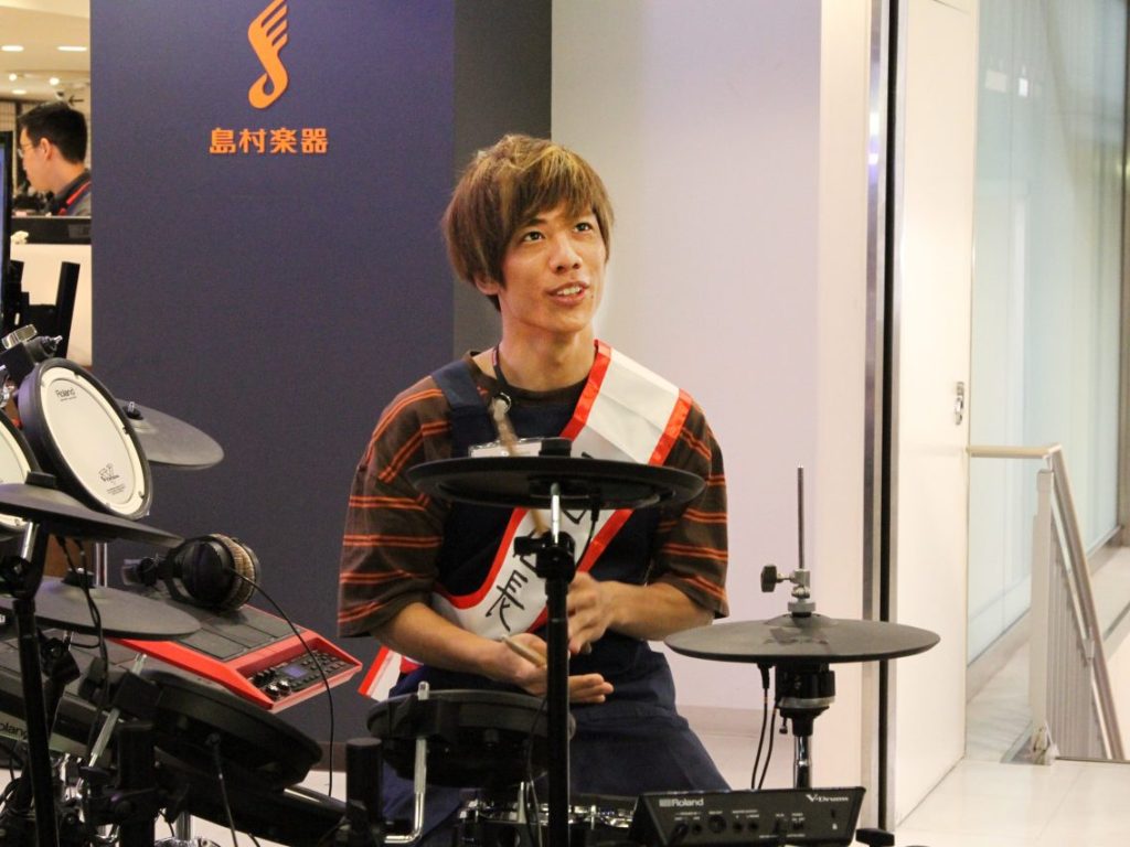 島村楽器 新宿PePe店の店長・佐瀬より、店長の職をLONGMANメンバーにバトンタッチ!「1日店長」のタスキをかけ、店長名札や島村楽器エプロンを着用いただきました。店長としてさわさんにはRYOGAコーナー、ギターボーカルのひらいさんにはギターコーナー、ドラム&コーラスのほりほりさんには電子ドラムコーナーにスタンバイいただきました。