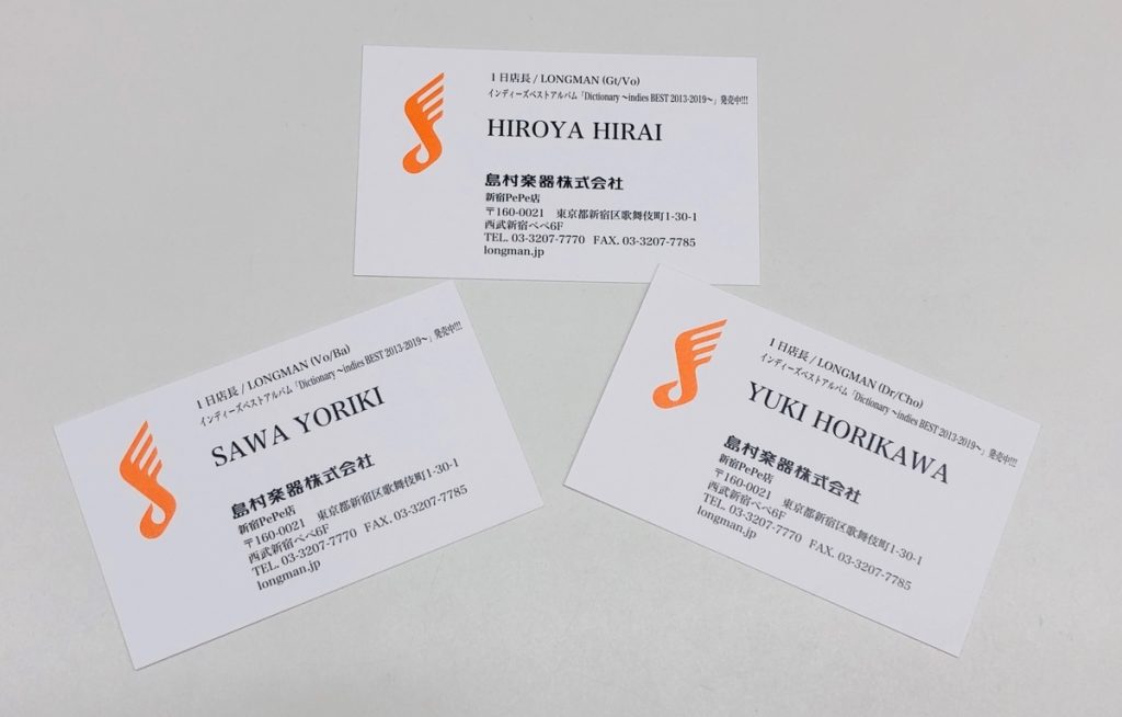 またメンバーの接客を受けて下さった方に対して、島村楽器1日店長の肩書が入った「限定名刺」とLONGMAN楽曲の「直筆コード譜」をプレゼントいたしました。