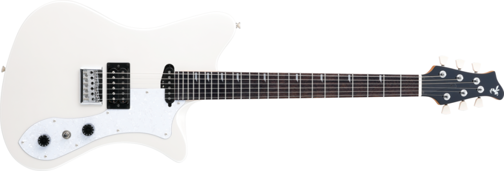 パールホワイトにパール柄ピックガード、シンプルなマスターボリューム仕様。