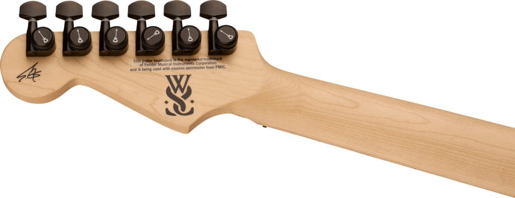ブラックハードウェアとFender® Strat®ヘッドストックが、精悍で統一感のあるビジュアルを演出します。