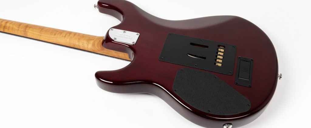 オクメボディがもたらす軽量でレスポンスに優れた鳴りに、高光沢ポリエステル仕上げのメイプルトップが明瞭なアタックと適度なハリを付与する構成です。