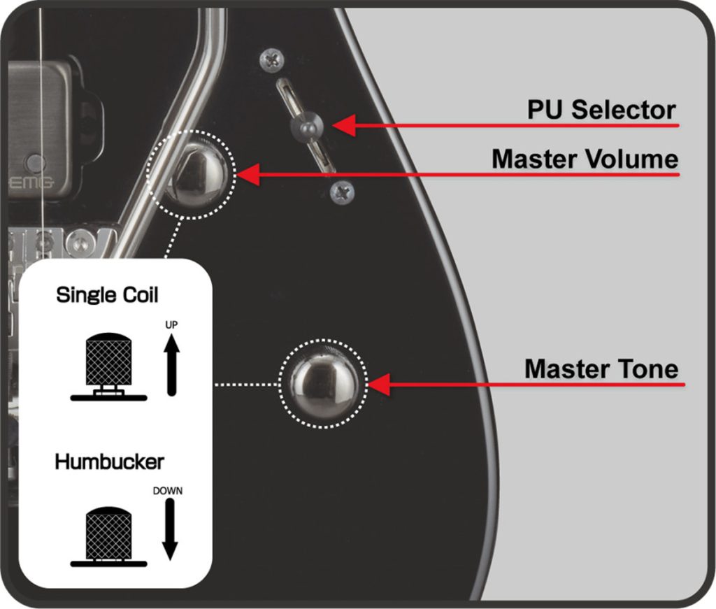 マスターボリュームおよびマスタートーンノブはプッシュ・プル仕様となっており、各ピックアップごとにシングル/ハムバッカーのモード切り替えが可能です。