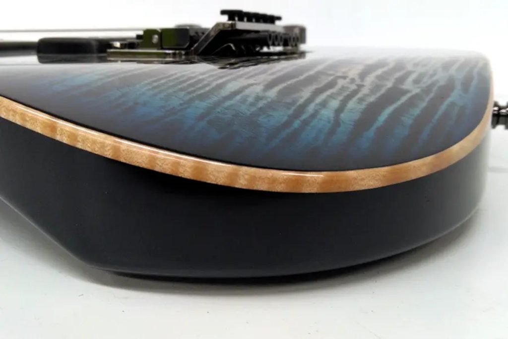 トップエッジにはあえて着色を行わないナチュラルバインディングが施され、フレイムメイプル本来の木目と質感が際立つ外観となっています。