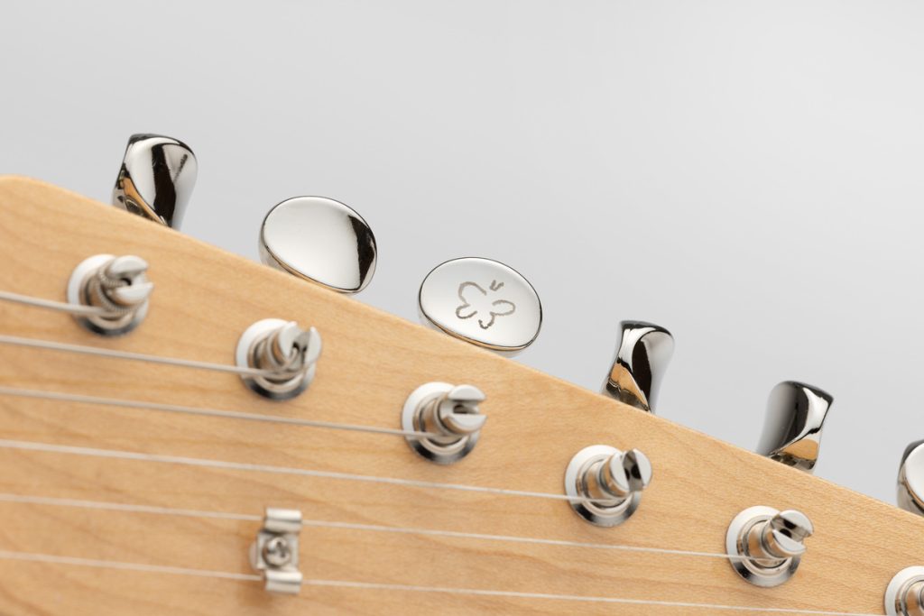 ネックプレートには本人のサインを刻印し、ペグボタンには蝶のモチーフを彫り込まれています。