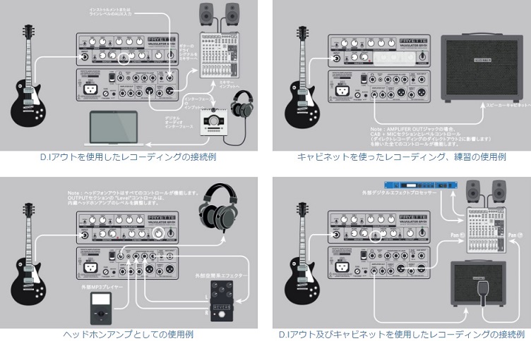 ヘッドホンアンプとして、家での練習に最適です。レコーディングのサウンドにこだわりたいけど、スペースや騒音の問題も・・そんな方にも、「キャビネットから出た音をマイクで拾った音」までシミュレートしていますので、最高のサウンドを目指すことができそうですね。もちろんキャビネットに直接つないでヘッドアンプとしても使用できます。