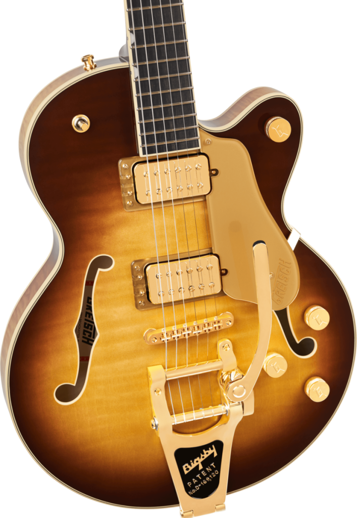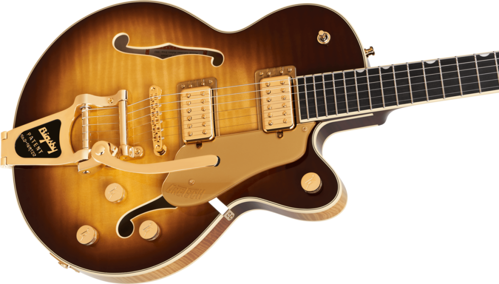 深めのカッタウェイ、12インチラジアス指板、ロールドエッジ、ストリングスルー式Bigsby® B7GPヴィブラートテイルピースなど、現代的なプレイヤーの要求に応える仕様が随所に採用されている点も大きな魅力です。