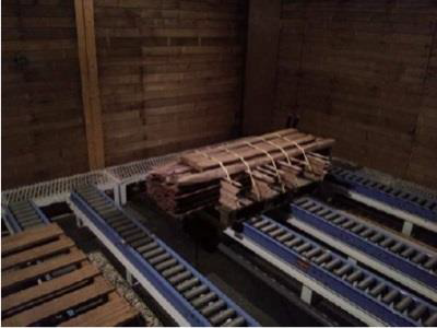 一般的な木材の乾燥炉はコンクリートや合成素材が使用されていますが、AEに使用されている木材は、木肌のままの樹木で構成された特殊な乾燥炉の中から生まれます。従来の乾燥炉を用いた急速・高温での乾燥方法とは異なり、遠赤外線を利用し40℃程度で芯からじっくりと時間をかけて木材を温め乾燥させます。