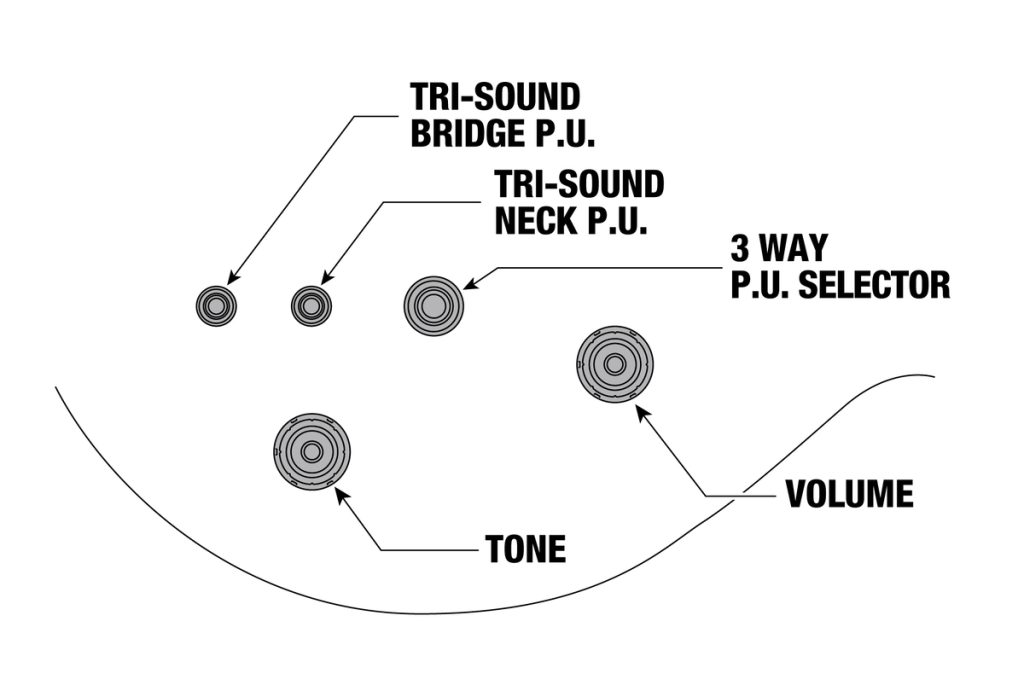 - Controls, Pickup selector: 2 Volume, 2 Tone, 3-way toggle switch