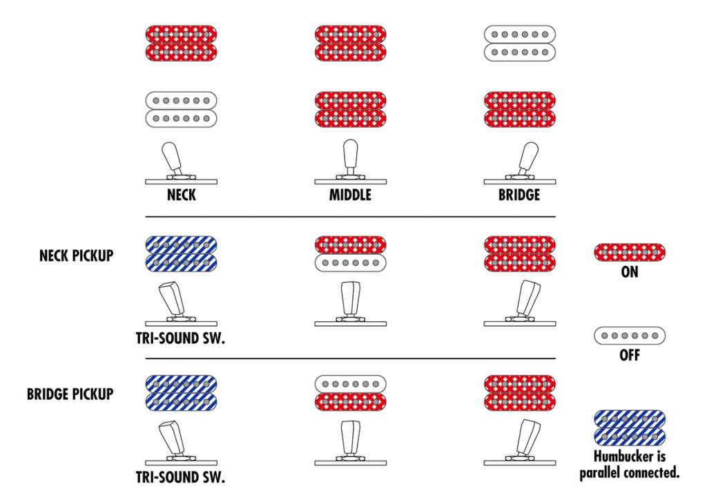 各スイッチにより、対応するピックアップを「シリーズ(通常のハムバッカー配線)/コイルタップ/パラレル」の3モードで切り替えることが可能です。