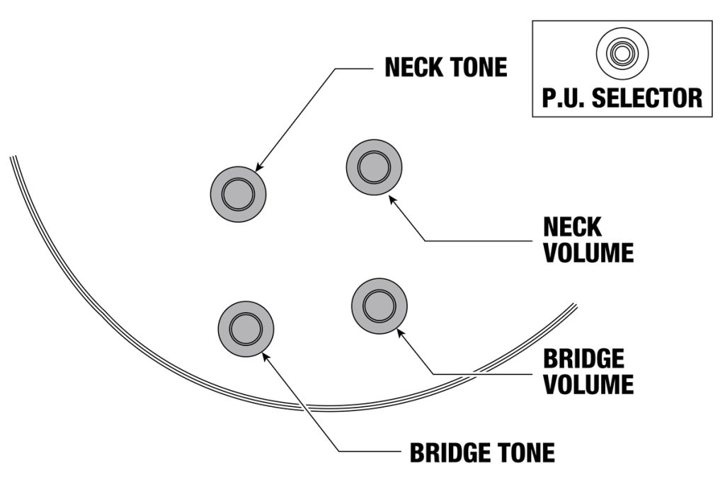 - Controls, Pickup selector: 2 Volume, 2 Tone, 3-way toggle switch