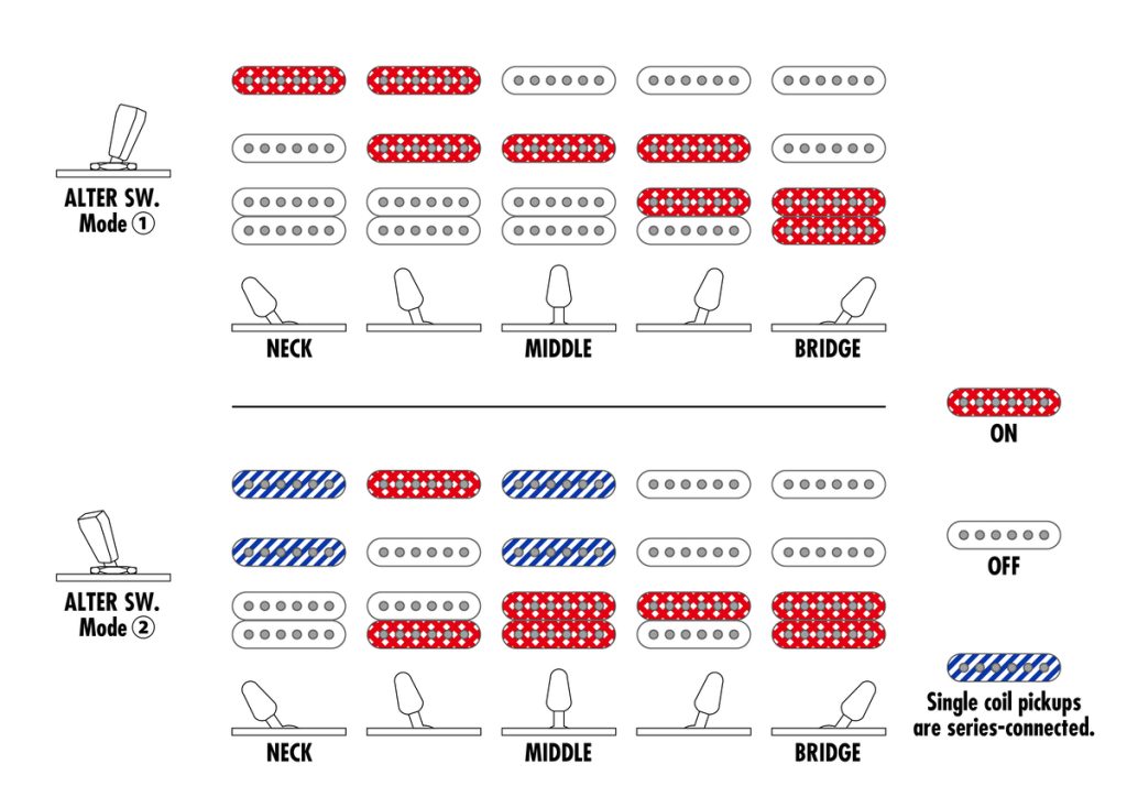 ネック側とセンターのピックアップを直列配線し、擬似的なハムバッカー・サウンドを作ることもできます。