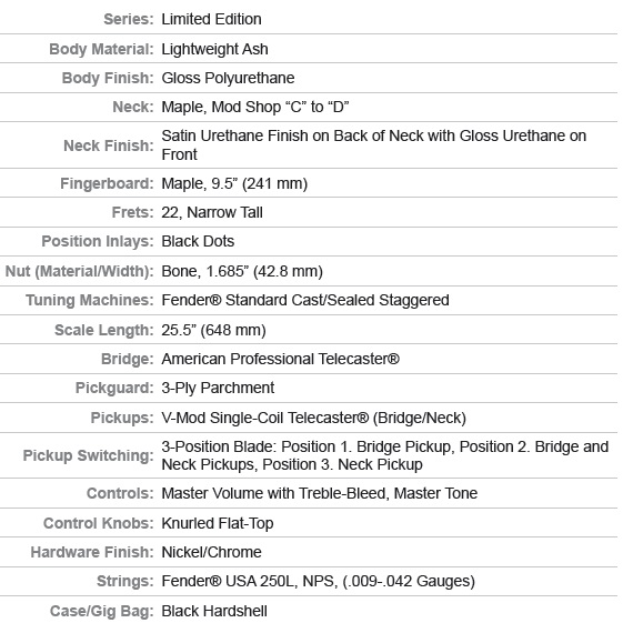 American Professional Telecasterに、ライトウェイトアッシュボディの限定モデルが登場。ボディマテリアルはライトウェイトアッシュ、ネックは「Deep C to D」シェイプのメイプルネックにメイプル指板を採用しています。ピックアップはTim ShawがデザインしたV-Modシングルコイルピックアップを搭載。音量を絞った際にも高音を維持するトレブルブリード回路を装備しています。