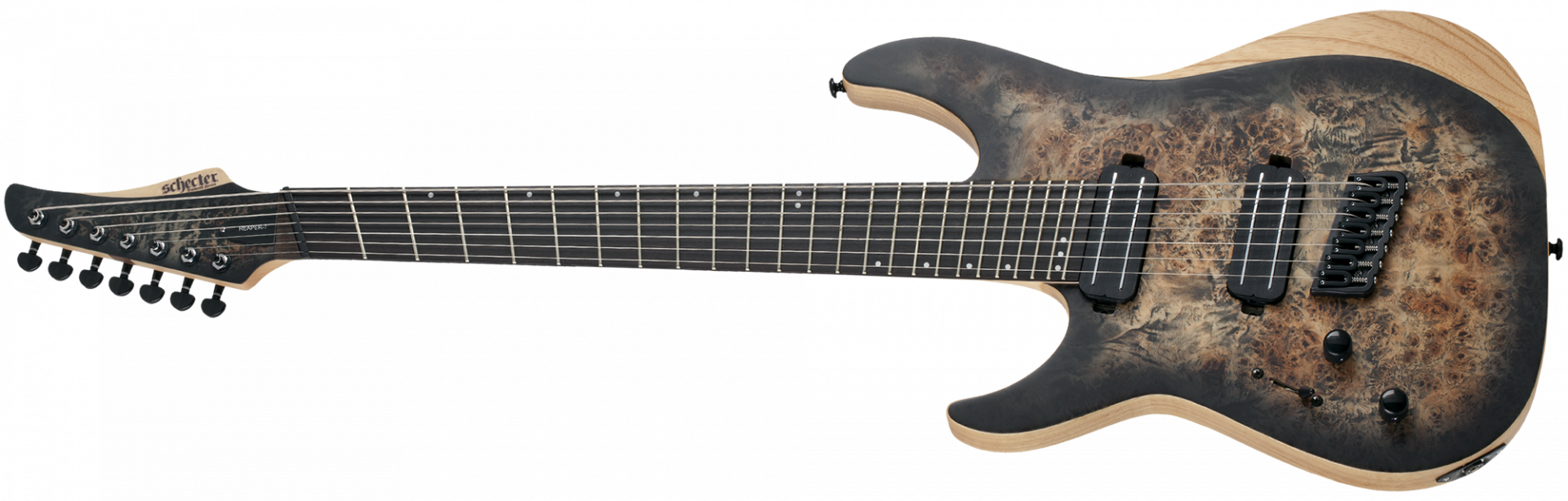Reaper-7 Multiscaleは、27”マルチスケールを採用した7弦モデル。ボディマテリアルはバールTOP/スワンプアッシュBACK、メイプルとウォルナットのラミネート構造のネックにエボニー指板を採用しています。電装系は、Schecter Diamond Decimatorを2基搭載。プッシュ/プルでのコイルタップ機能で多彩なサウンドメイクが可能となっています。