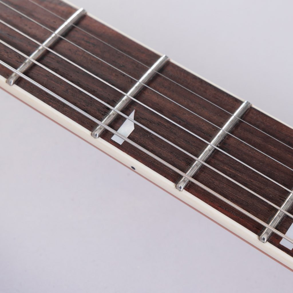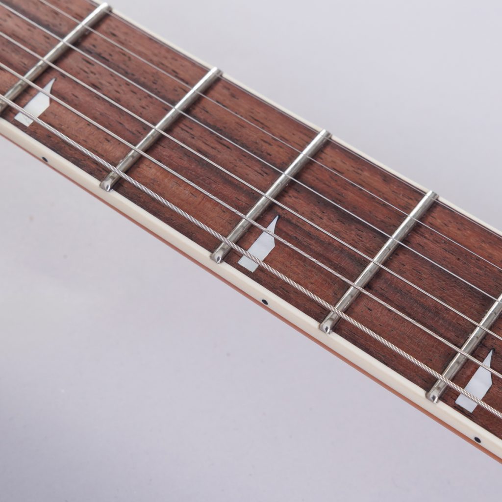 ボディ深くまで挿し込まれたネックは、指板部分にスロープ加工を施しています。