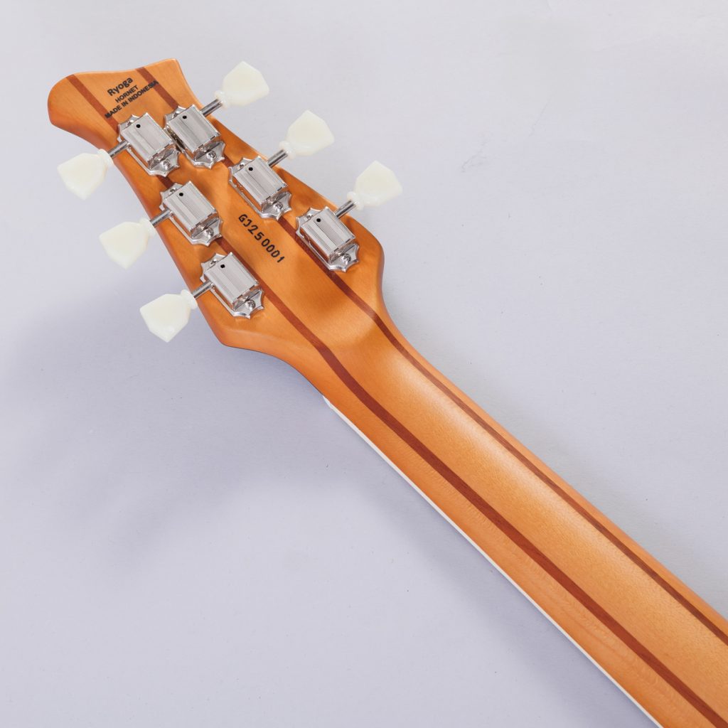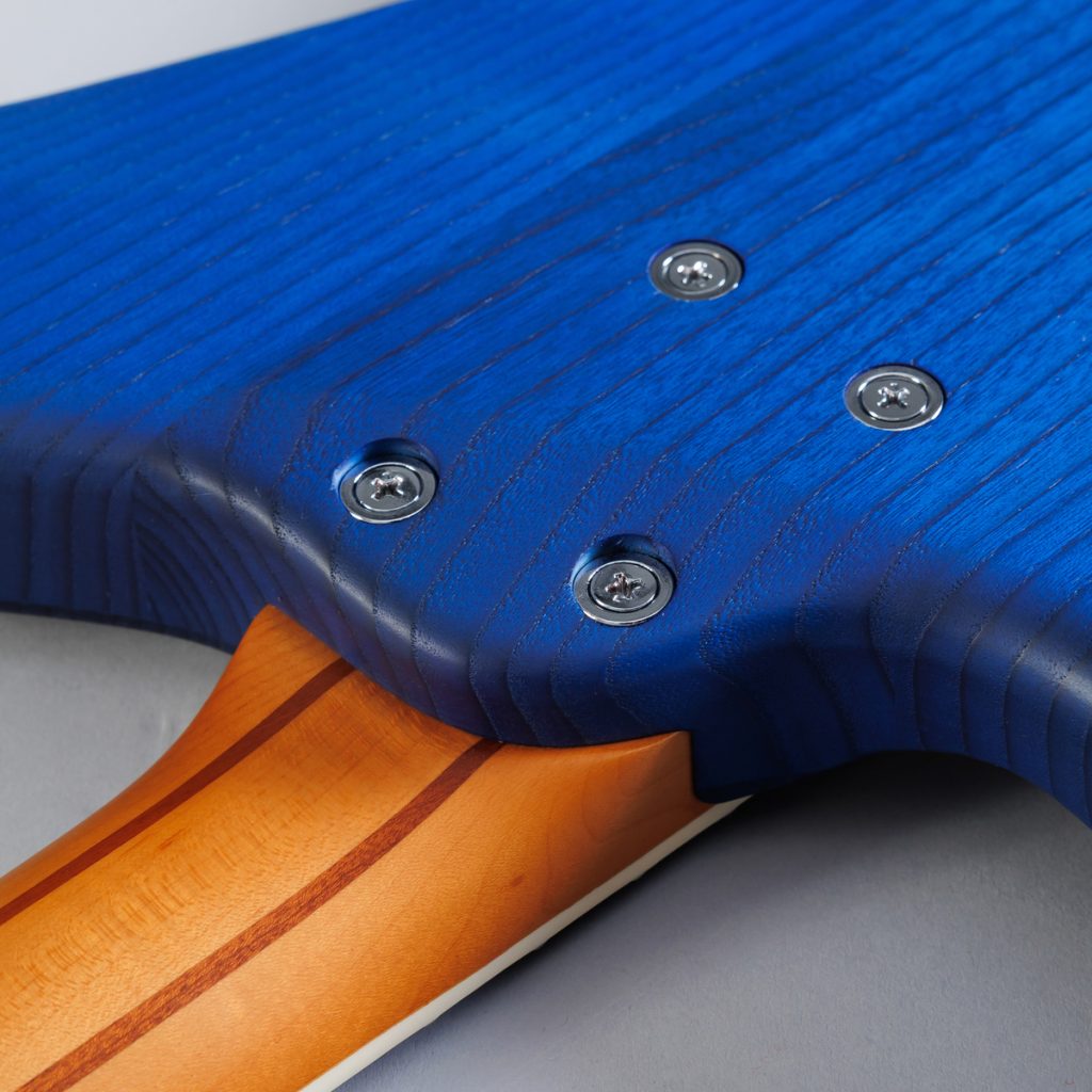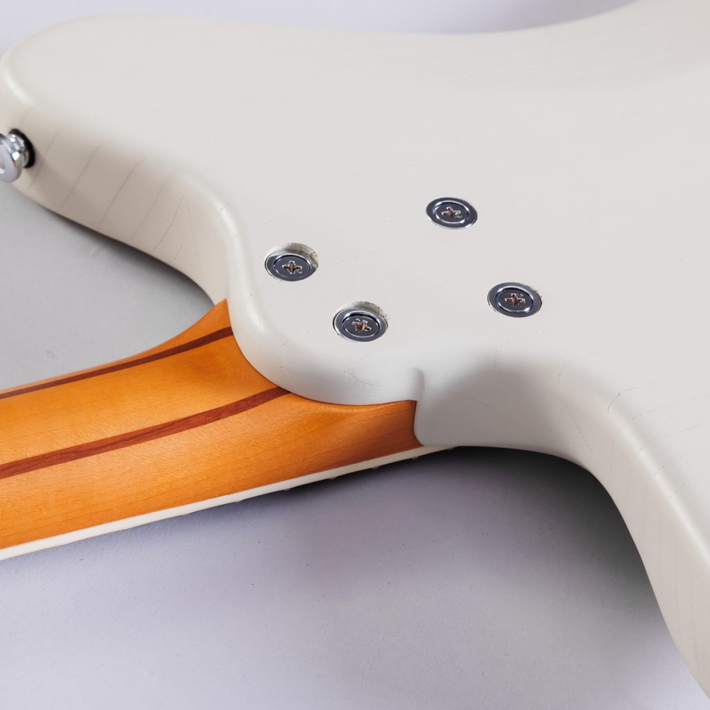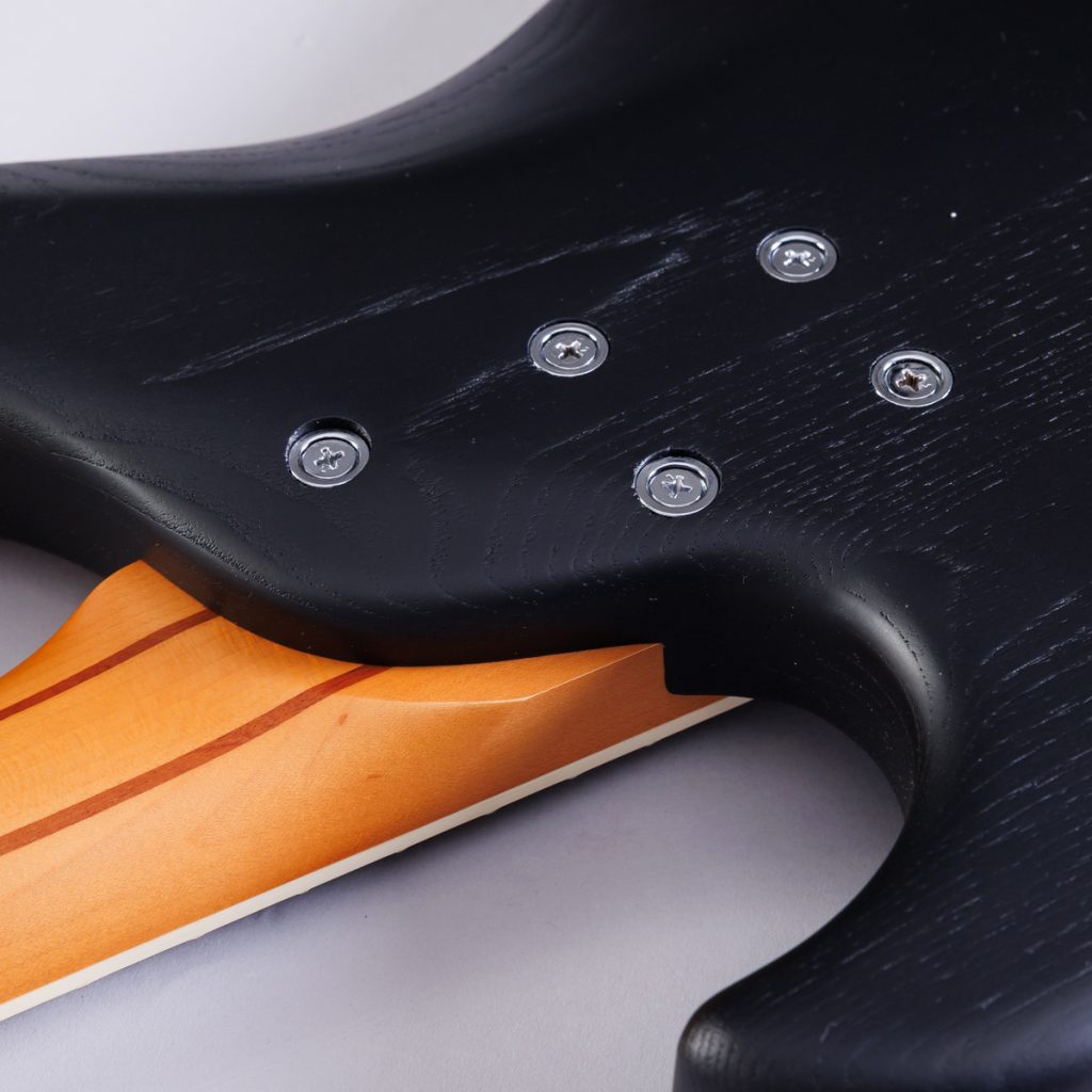ネックには、3mm厚のサペリ材を2枚挟んだ5プライ構造のハードメイプルを採用しました。