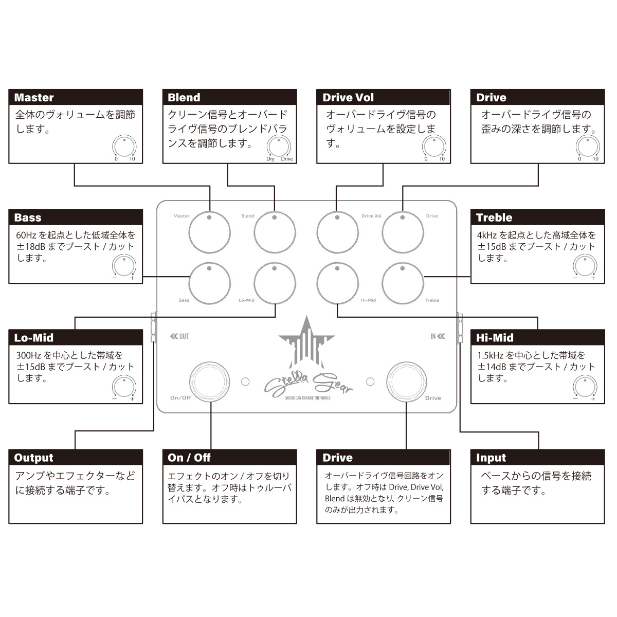 コントロール:Master Vol、Blend、Drive Vol、Drive、Bass、Lo-Mid、Hi-Mid、Treble、On/Off スイッチ、Driveスイッチ