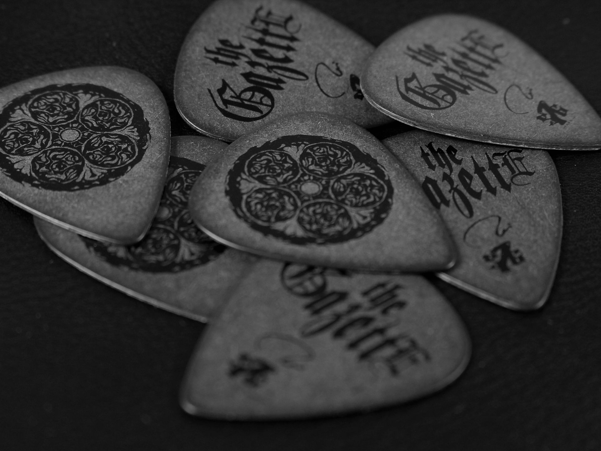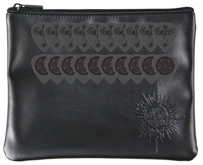 葵氏デザインによるシグネチュアピックです。0.8 mm、ポリアセタール素材のティアドロップ型で、片面に葵氏ロゴ、もう片面にはthe GazettE&葵氏サインが印字されています。