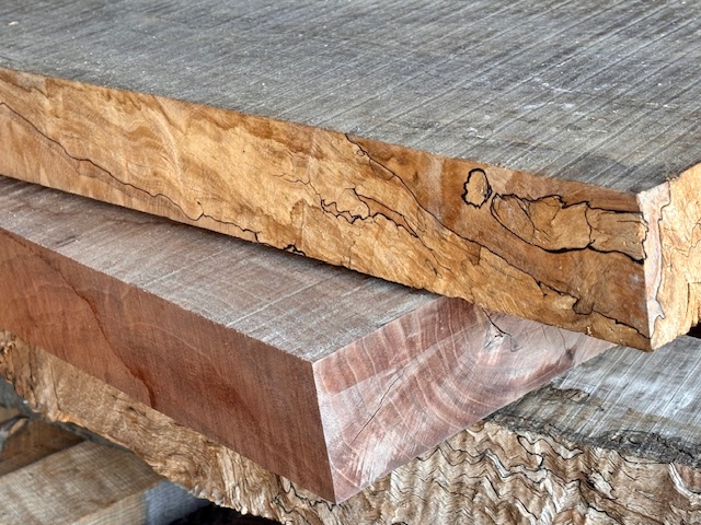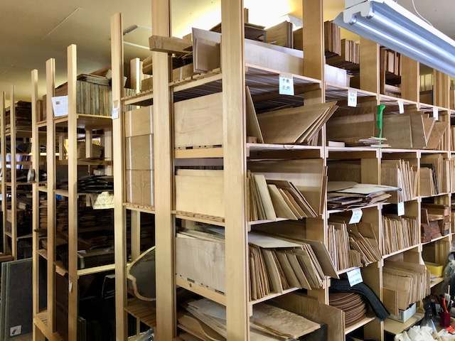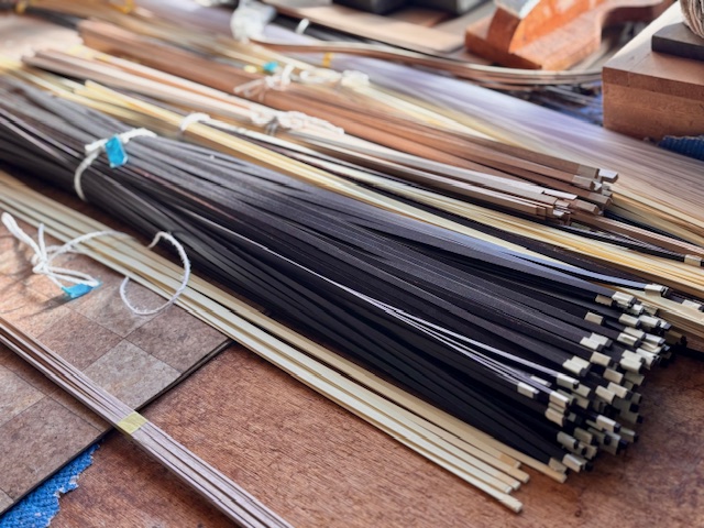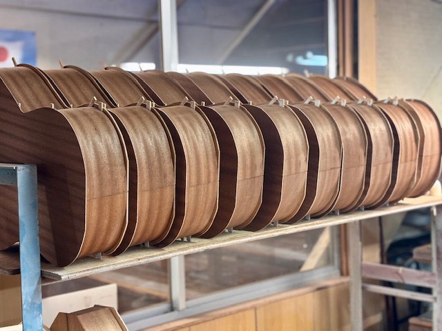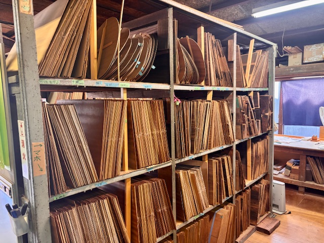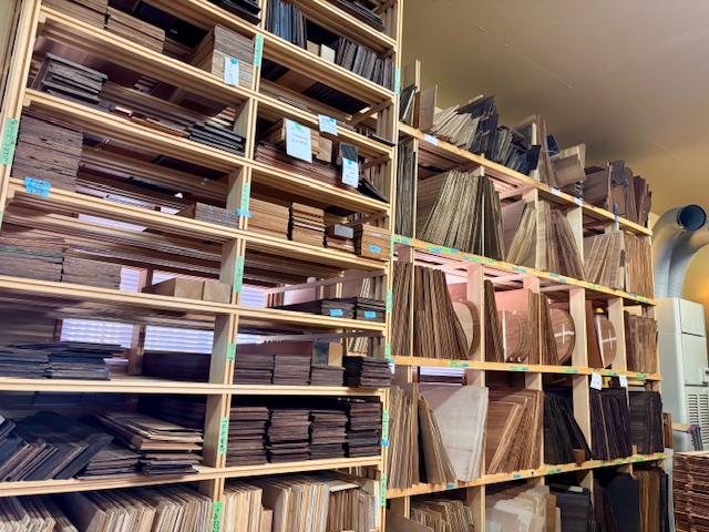 スプルース、マホガニー、ローズウッドといった定番材から、コア、ハカランダといった希少材まで、世界各地から厳選されたトーンウッドが工房内で静かに眠っています。