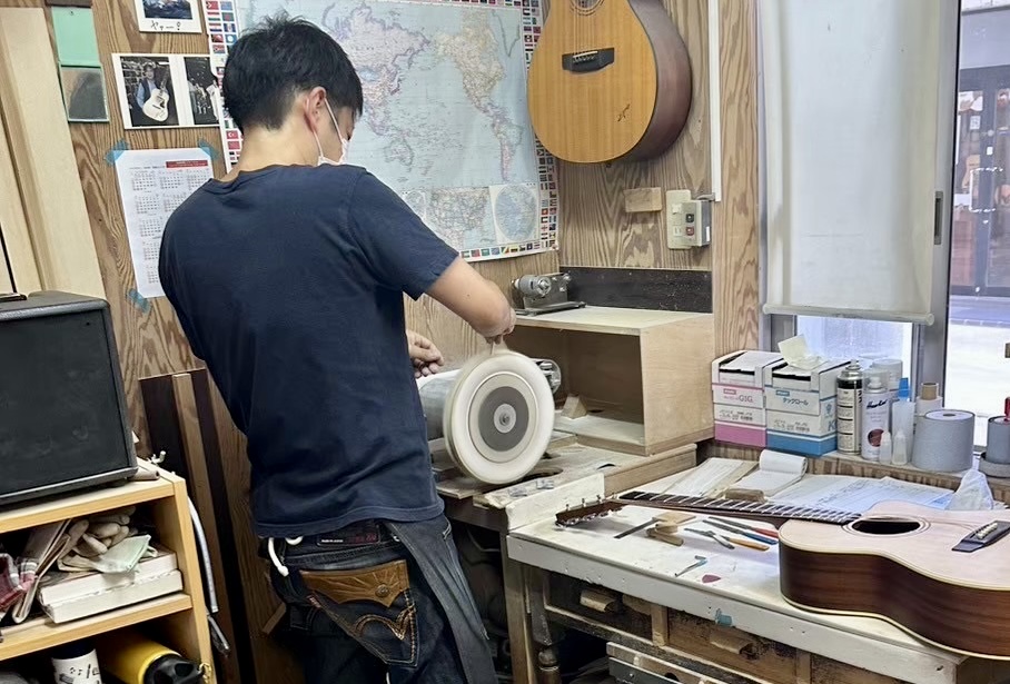 塗装を終えた表面には、わずかな“ゆず肌”と呼ばれる凹凸が残ります。これを丹念に磨き上げ、滑らかで深みのある光沢を与えるのがこの工程です。磨き終えたボディは、光を映し返すほどの輝きを放ち、木の奥行きと温もりが一層際立ちます。