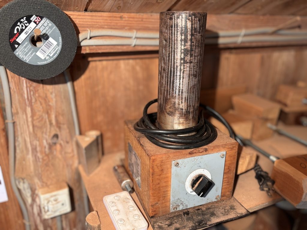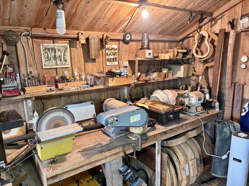 納屋を改装した工房と、ウッドファストの台・ドリルスタンド・曲げ型