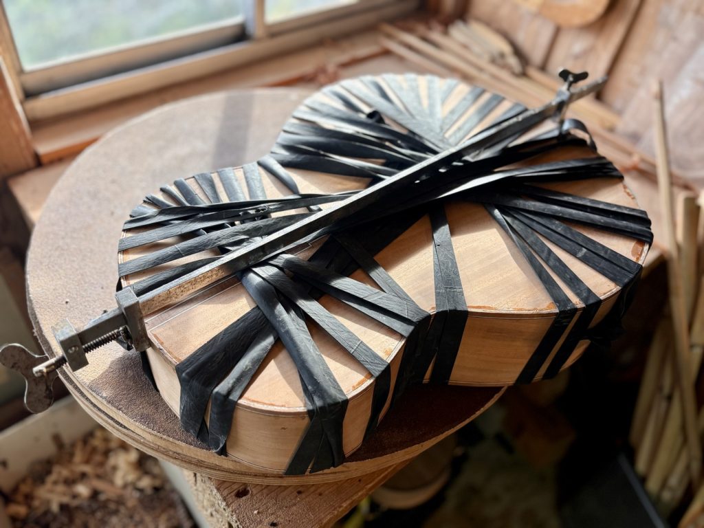 黒いゴムバンドやクランプで圧力をかけて固定し、ボディの保護と装飾を兼ねた縁取りを施す、工房ならではの一般的な製作工程が写し出されています。