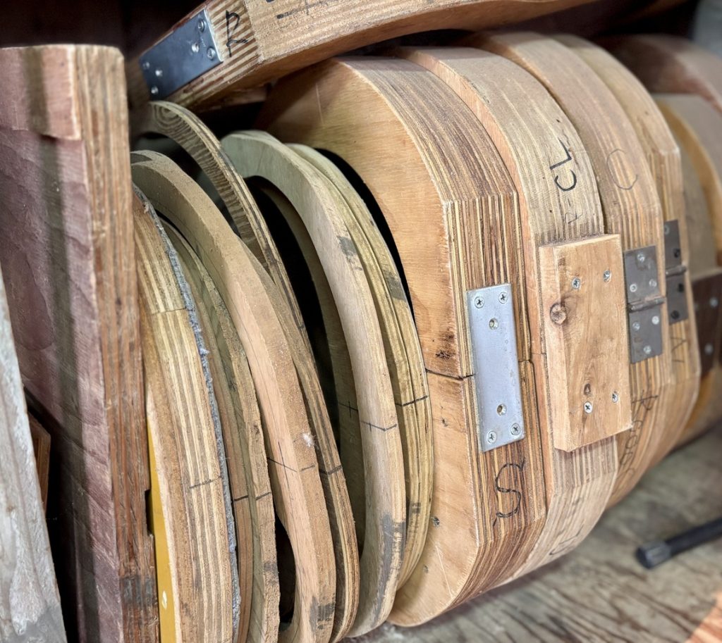 ギターなどの楽器製作で、木材の側板を曲げてボディ外形を形づくる際に使用される木製の成形型(モールド/フォーム)です。