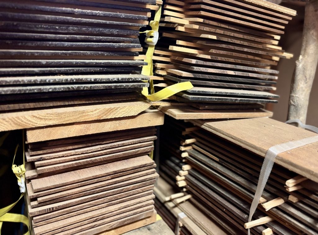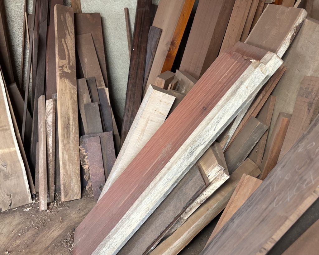 長期間自然乾燥させて含水率を安定させた、希少な美しい杢目を持つ木材の在庫です。