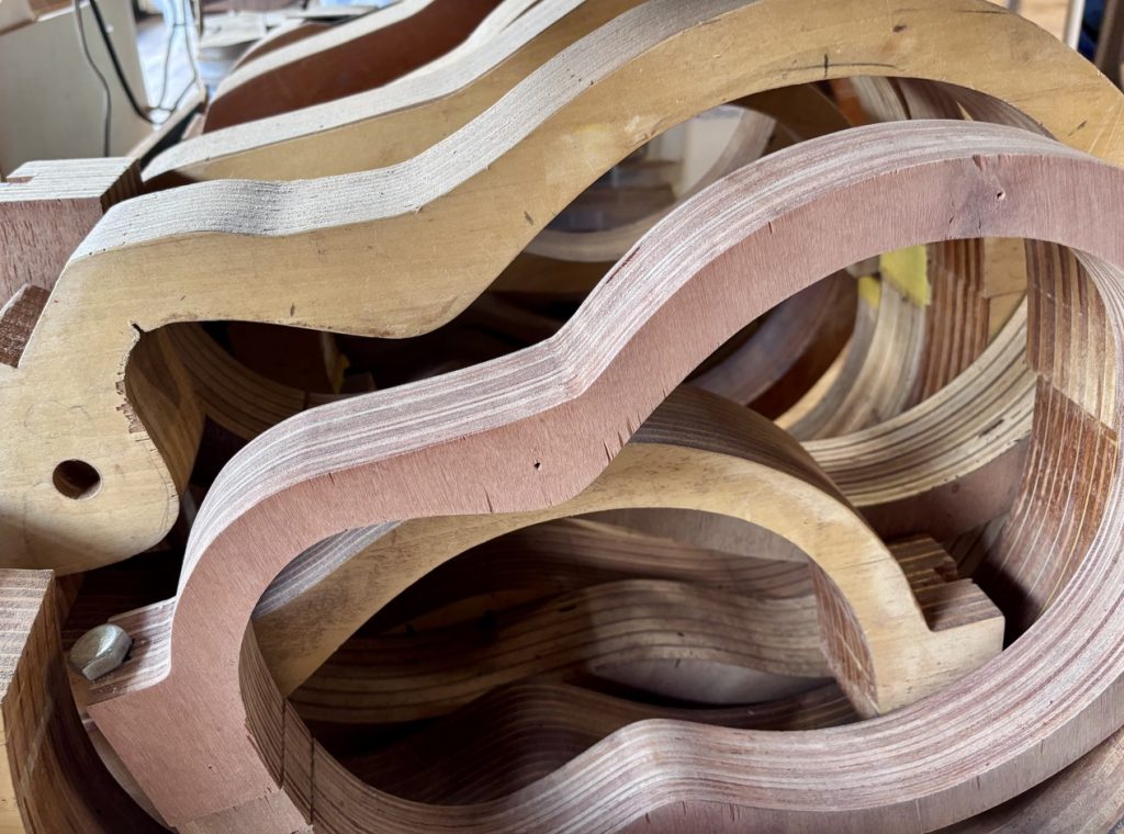 薄くスライスした木材を複数枚積層して接着し、型に合わせて曲げてあるもので、独特のボディ形状を安定して再現するための“土台”として使われます。