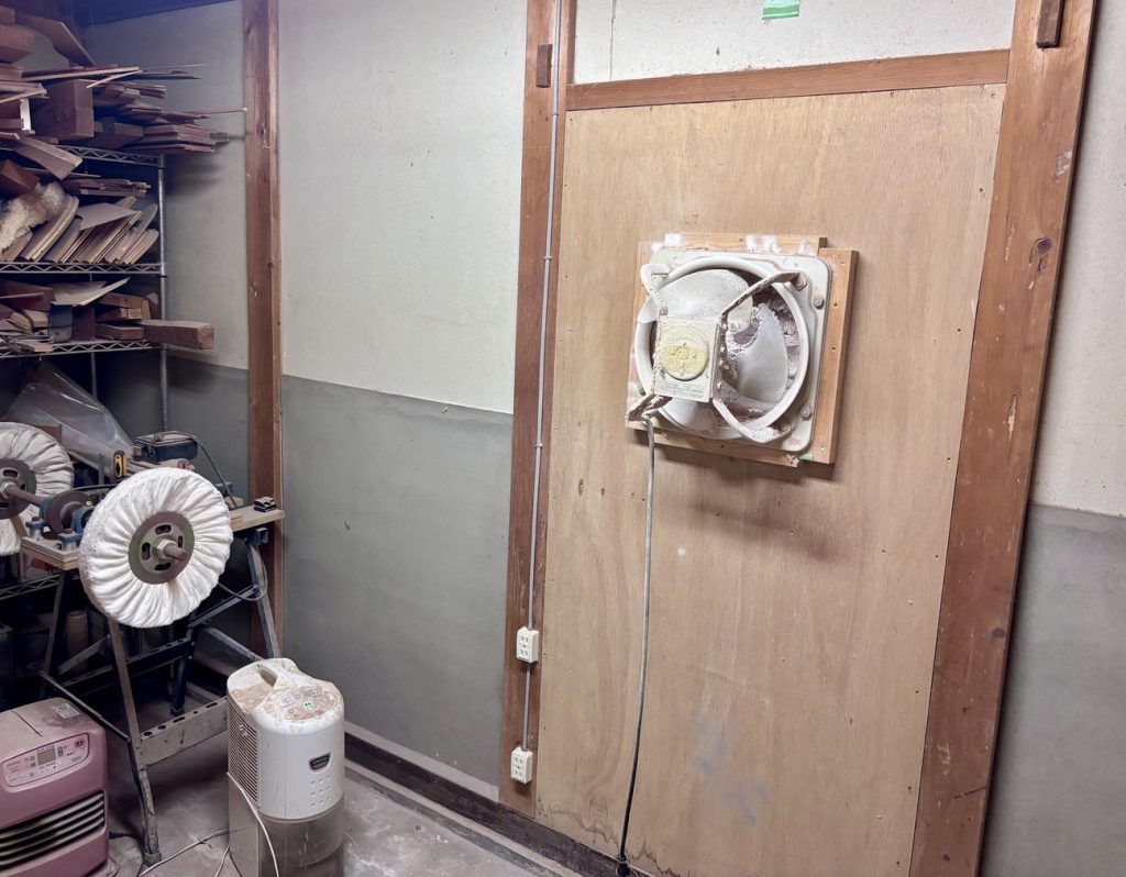 揮発性の高いラッカー塗料のミストや有機溶剤を換気扇で外部へ排出しつつ、塗膜を薄く均一に仕上げるために、乾燥時間や湿度管理にも配慮された環境で作業を行います。
