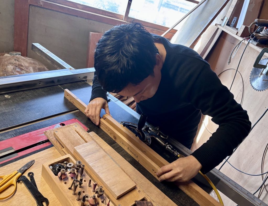 トップの製材やサイドの曲げ、箱(ボディ)の組み立て、ネックの最終シェイプ一歩手前までといった、アコースティックギター製造の木工主要工程を幅広く担当し、「量をこなすことでしか見えてこない基準値」や「製品としての均一さ・精度」を身体で身につけていった。