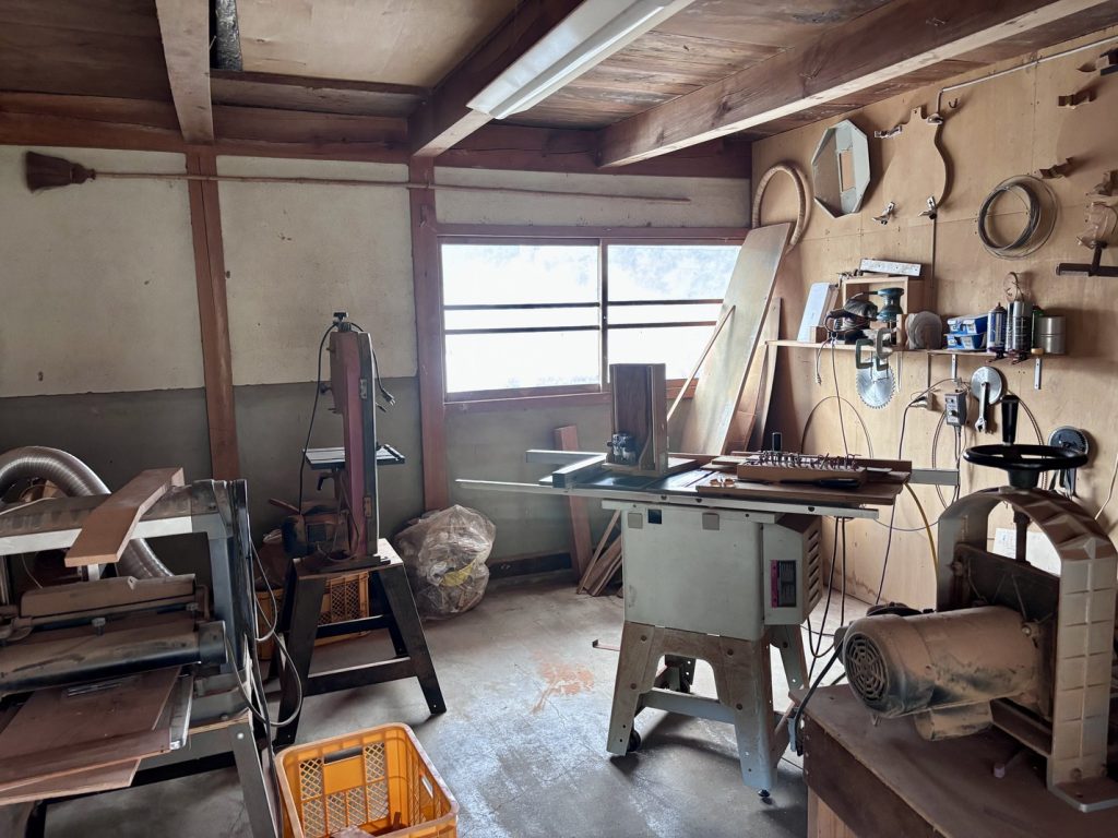 ボディやネックの大まかな成型・切削は、メインルームとは別のスペースで行われ、粉じんや騒音を伴う作業と、組み立てや調整といった繊細な工程が、自然に分けられています。