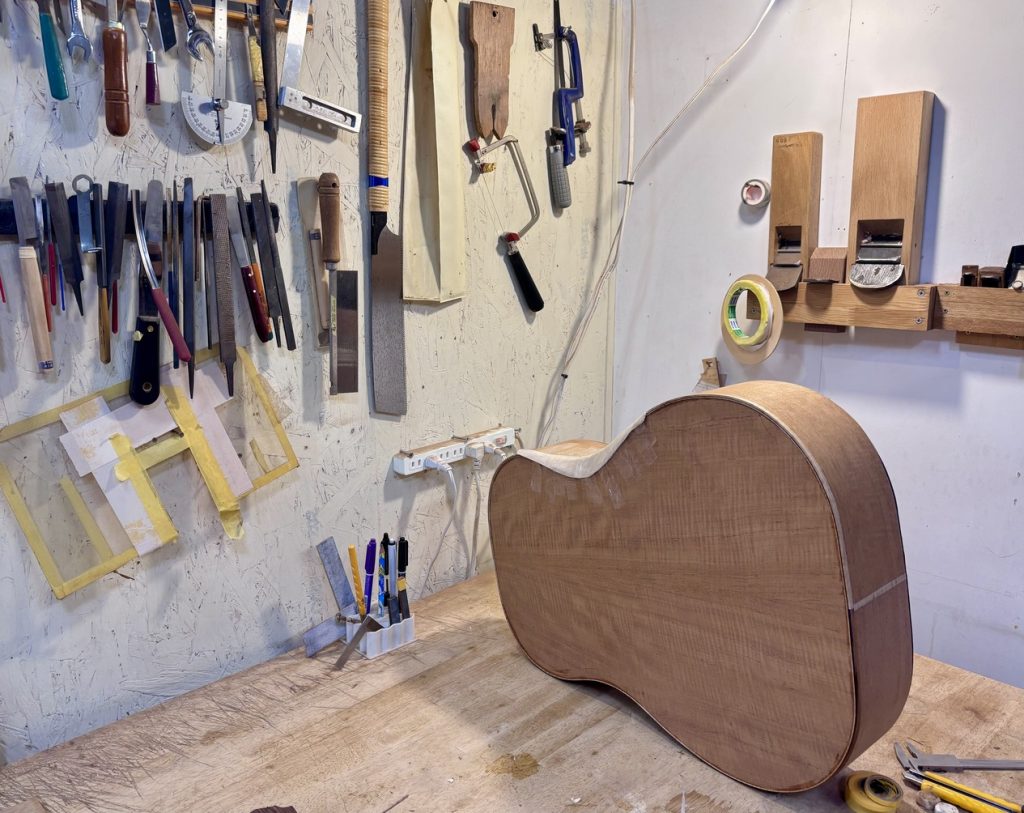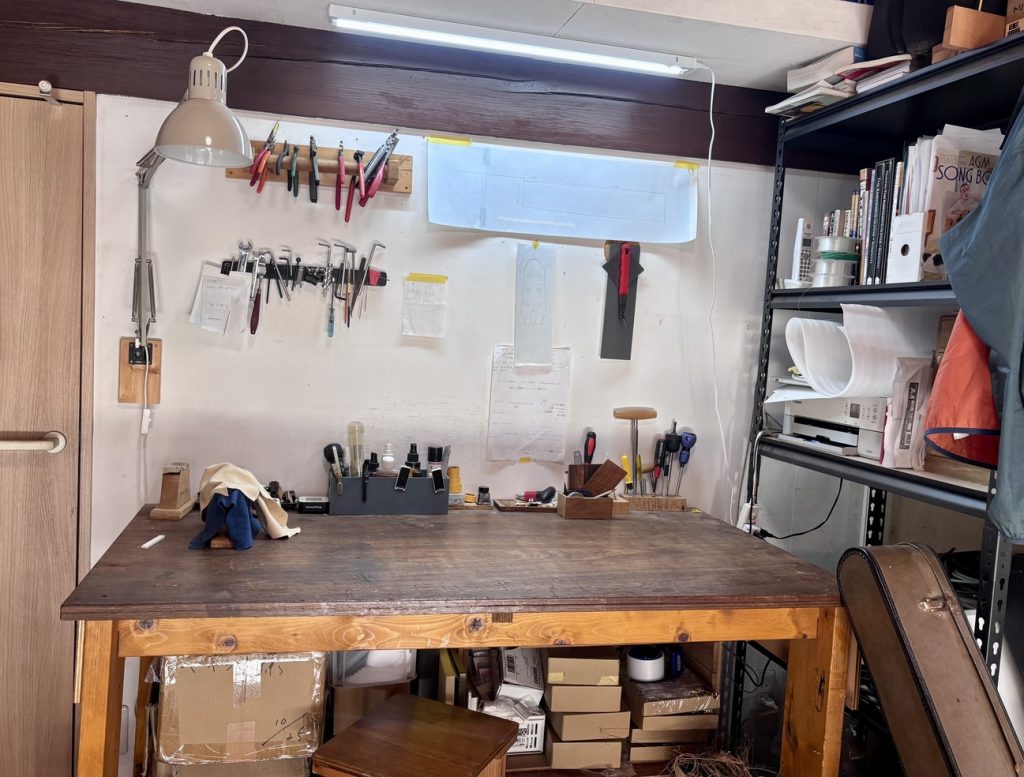 メインの作業部屋には、一本一本のギターとじっくり向き合うための治具や道具が、手を伸ばせばすぐ届く位置にコンパクトにまとめられていて、「必要なものだけが、必要なだけ置いてある」という印象を受けました。