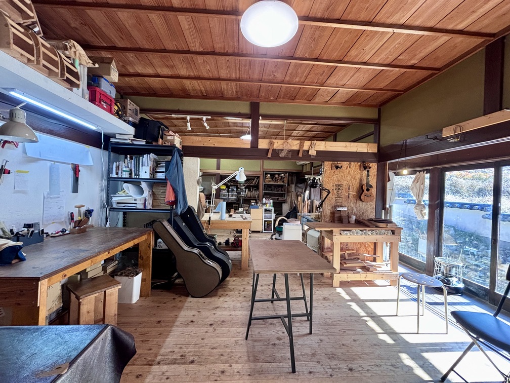 中に足を踏み入れると、空気がすっと落ち着いて、作業台の上のギターと、壁際に並んだ道具たちが静かにこちらを迎えてくれるような感覚になります。