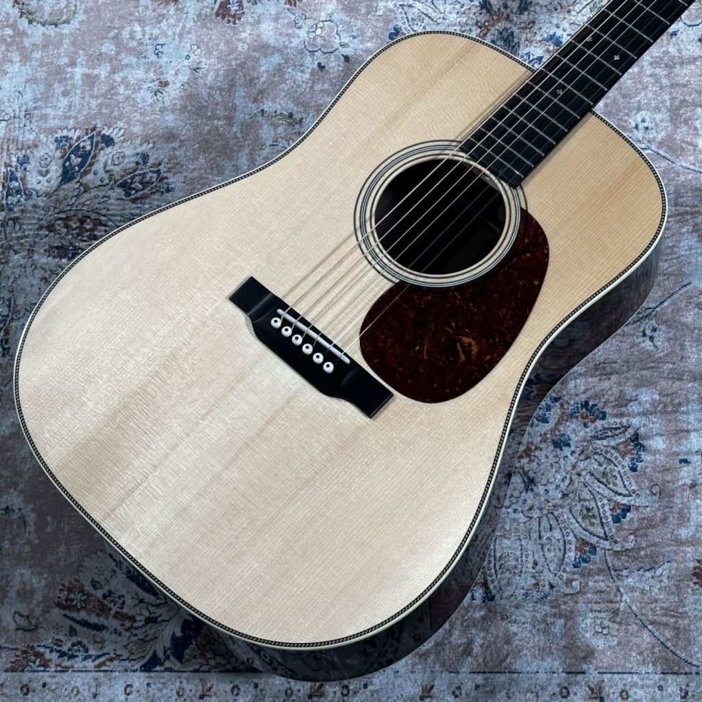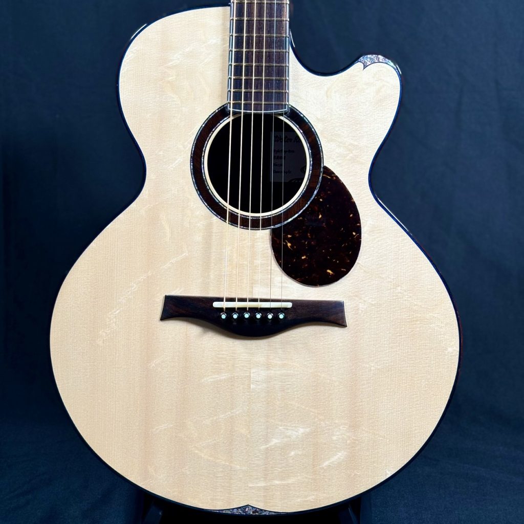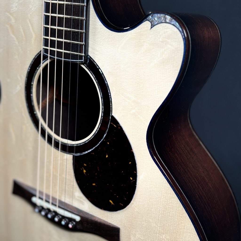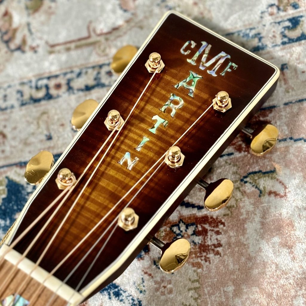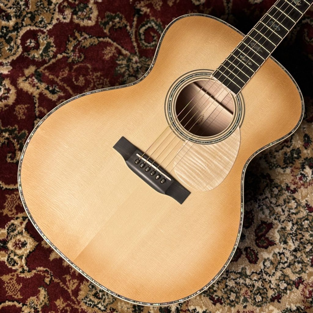 Martinカスタムショップのプレビルドカスタム現地買付品。トップ材には認定ユーロスプルースを使用し、高い音響性能を持つパシフィック ビッグ リーフ フレイムメイプルがバックとサイドを彩ります。