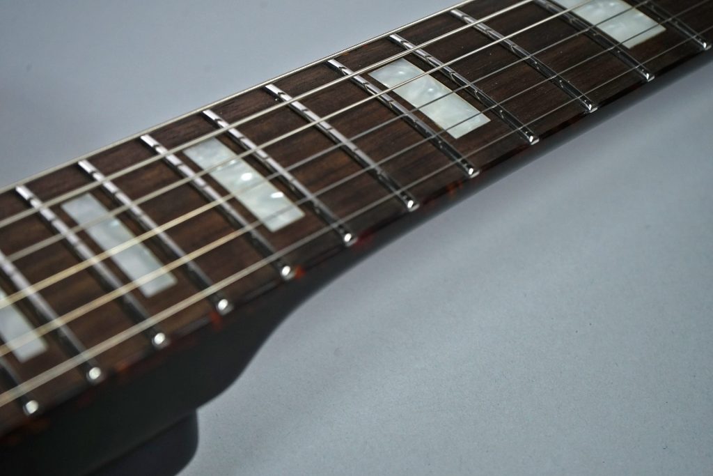 こういったトラディショナルなモデルにはあえて使っていなかったステンレスフレットですが、今回は選んでみました。アルダーボディ、ローズ指板にハムバッカーを採用したため、ブライトさの後押しになると思ってのチョイスです。