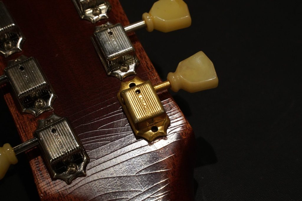 1弦のチューナーを見て頂くのが分かり易いですが、現行品はボタンがヘッドストックの外周から少し離れた位置にあるため、ボタンの根元にあるリングとヘッドストックの間にシャフトが見えます。