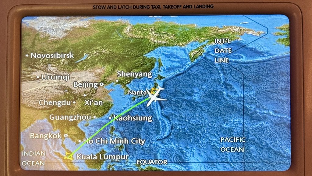 22:50 定刻から少し遅れてテイクオフ。これより14時間を掛けて、成田空港→クアラルンプール国際空港→スラバヤ空港というルートで現地に向かいます。
