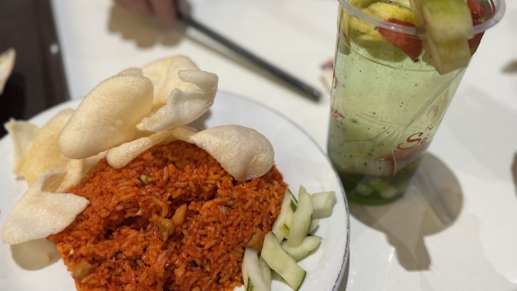 ナシゴレンとフルーツジュース(念のため氷抜き)をセレクトしました。お会計は5人で合計275,000ルピア、日本円にして約2,400円という安さでした。
