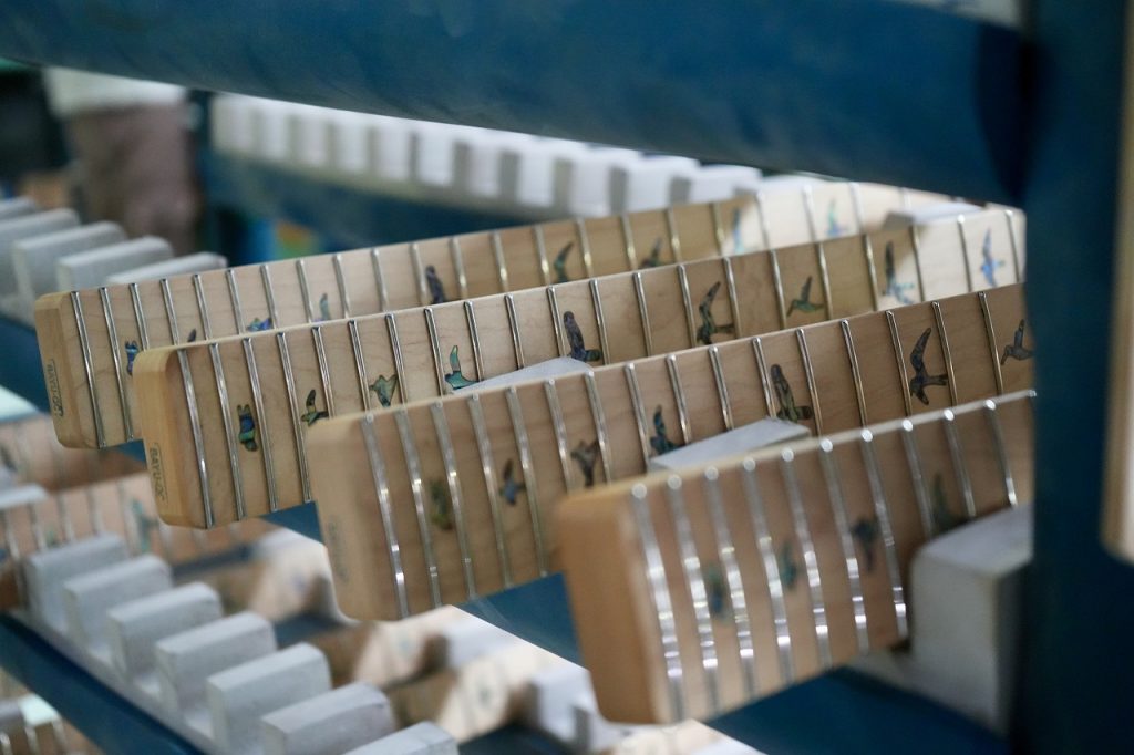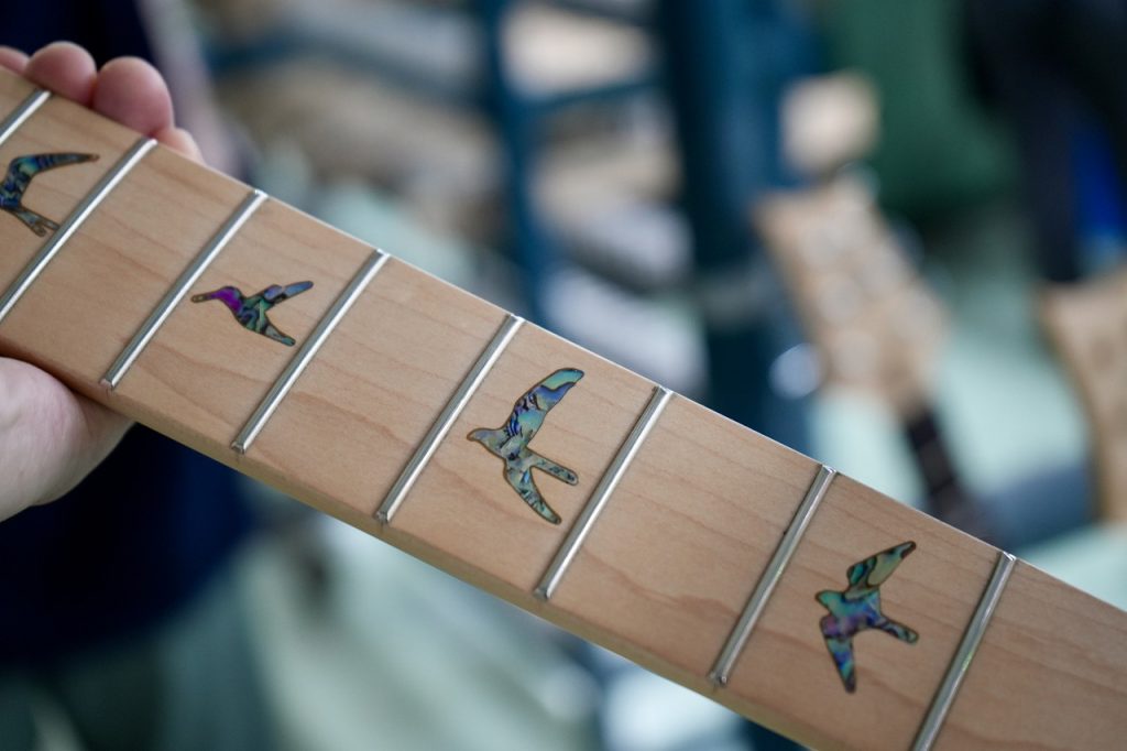 指板のインレイ作業を担うの精鋭職人で、その手法は USA と全く同じプロセスが貫かれており、メイプル指板にはアバロン、ローズウッド指板にはマザー・オブ・パールを非常にタイトな精度で埋め込んでいきます。