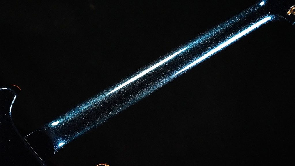 ボディバックからそのまま繋がるように、ネックの裏側も鮮やかな「ブルー・スパークル」で統一されています。